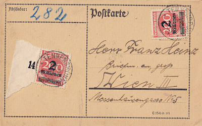 Foreign postcard from 24.10.1923 franked with 2 stamps a 2 Million Mark on 200 Mark (=4 Million Mark)