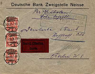 Inland cover with special delivery (1-20 g) from 24.10.1923 franked with 3 stamps a 10 Million Mark (=30 Million Mark, 10 Million cover 20 Million special delivery)