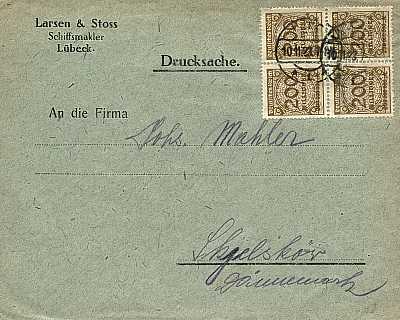 Auslandsdrucksache (1-50 g) vom 10.11.1923 frankiert mit 4 Marken a 200 Millionen Mark (=800 Millionen Mark)