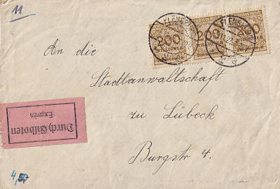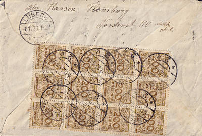 Inlandsbrief mit Eilzustellung (1-20 g) vom 05.11.1923 frankiert mit 15 Marken a 200 Millionen Mark (=3 Milliarden Mark, 1 Milliarde Brief 2 Milliarden Eilzustellung)
