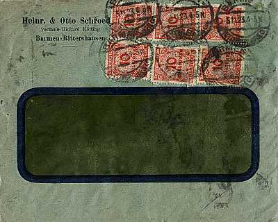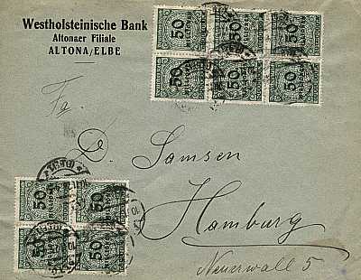 Ortsbrief (1-20 g) vom 10.11.1923 frankiert mit 10 Marken a 50 Millionen Mark(=500 Millionen Mark)