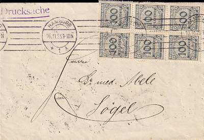 Inland printed matter (1-25 g) from 16.11.1923 franked with 20 stamps a 100 Million Mark (=2 Billion Mark)