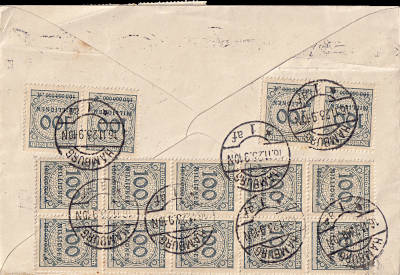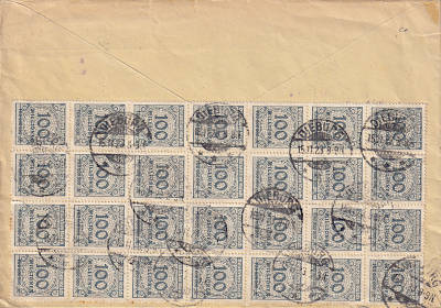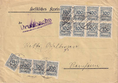 Inland printed matter (26-50 g) from 15.11.1923 franked with 40 stamps a 100 Million Mark (=4 Billion Mark)