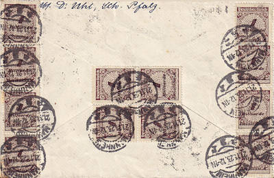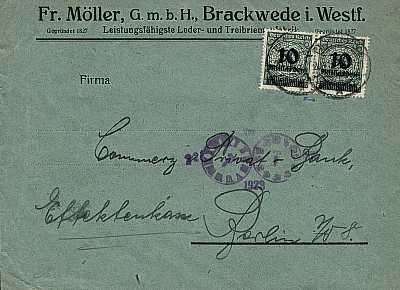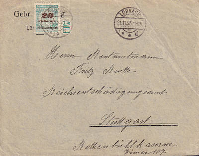 Inland cover (1-20 g) from 20.11.1923 franked with 2 stamps a 10 Billion Mark on 50 Million Mark (=20 Billion Mark) |