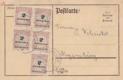 Inland postcard from 23.11.1923 franked with 5 stamps a 2 Billion Mark (=10 Billion Mark)