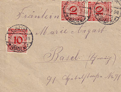 Foreign cover (1-20 g) from 02.01.1924 franked with 3 stamps a 10 Pfennig(=30 Pfennig)