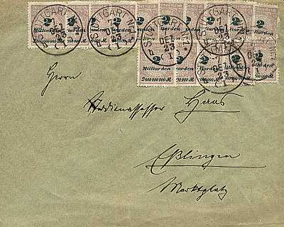 Inland printed matter (1-50 g) from 07.12.1923 franked with 15 stamps a 2 Billion Mark (=30 Billion Mark)