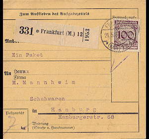 Inlandspaketkarte (7 000 g, 75-375 km) vom 21.05.1924 frankiert mit einer Marke a 100 Pfennig (=1 Mark)