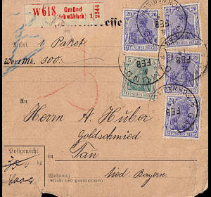Inlandspaketkarte mit Wertangabe (400 g, > 75 km) vom 04.02.1919 (3. Periode) frankiert mit 5 Marken (=85 Pfennig, 75 Paket 10 Wert) |