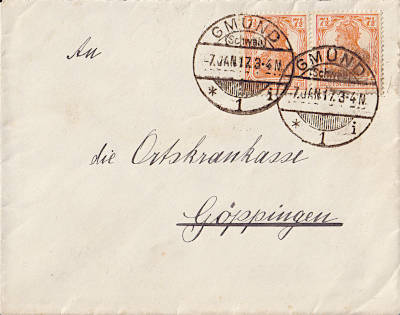 Inlandsbrief (1-20 g) vom 07.01.1917 (2. Periode) frankiert mit 2 Marken a 7½ Pfennig (=15 Pfennig) |
