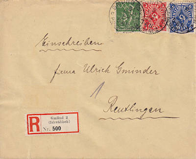 Inlandsbrief mit Einschreiben (1-20 g) vom 09.11.1922 (9. Periode) frankiert mit 3 Marken (=10 Mark, 6 Brief 4 Einschreiben) |