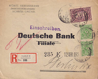 Inlandsbrief mit Einschreiben (1-20 g) vom 10.04.1923 (13. Periode) frankiert mit 3 Marken (=180 Mark, 100 Brief 80 Einschreiben) |