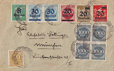 Inlandsbrief (1-20 g) vom 20.10.1923 (21. Periode) frankiert mit 10 Marken a 1 Million Mark (=10 Millionen Mark) |