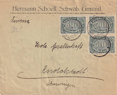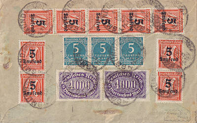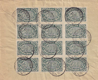 Inlandsbrief (1-20 g) vom 12.09.1923 (17. Periode) frankiert mit 15 Marken a 5 000 Mark (=75 000 Mark) |