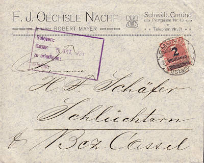 Inlandsbrief (1-20 g) vom 02.10.1923 (19. Periode) frankiert mit einer Marke a 2 Millionen Mark auf 5 000 Mark (=2 Millionen Mark) |