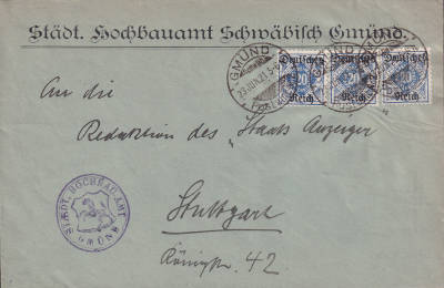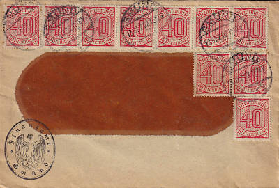 Ortsbrief (1-20 g) vom 13.12.1922 (10. Periode) frankiert mit 10 Marken a 40 Pfennig (=4 Mark) |