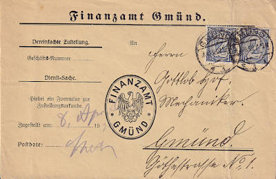 Ortszustellungsauftrag (1-20 g) vom 08.04.1922 (7. Periode) frankiert mit 2 Marken a 2 Mark (=4 Mark, 1,25 Brief 1,50 Zustellung 1,25 Urkunde) |