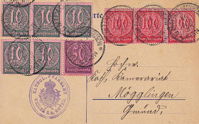 Inlandspostkarte vom 16.08.1923 (15. Periode) frankiert mit 9 Marken (=400 Mark) |