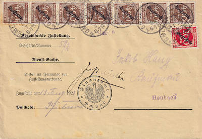Zustellungsauftrag (1-20 g) vom 11.08.1923 (15. Periode) frankiert mit 8 Marken (=3 000 Mark, 1 000 Brief 1 000 Zustellung 1 000 Urkunde) |