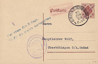 Inlandspostkarte mit Einschreiben vom 21.08.1918 (3. Periode) frankiert mit 2 Marken a 10 Pfennig (=20 Pfennig, 0 Postkarte 20 Einschreiben); bei dieser gebührenfreien