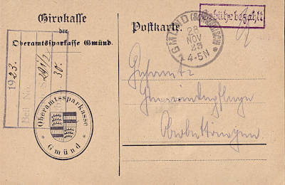 Inlandspostkarte vom 17.11.1923 (24. Periode) frankiert mit 5 Milliarden Mark |