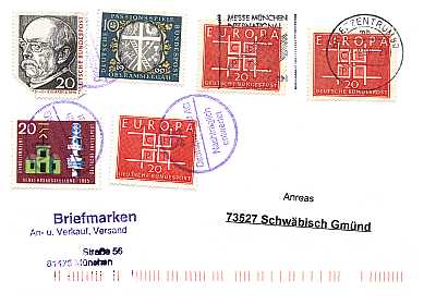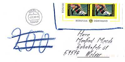 Brief frankiert mit ungültigen Briefmarken ohne Nachporto. Die Marken in DM-Nominale wurden als €-Marken verwendet |