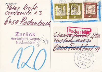 Postkarte frankiert mit ungültigen Briefmarken mit Nachportoerhebung |