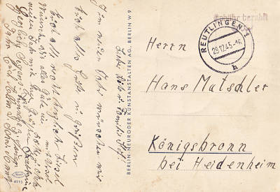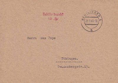 Reutlingen 1: Inlandsbrief (1-20 g) vom 29.09.1945 mit rotem Zweizeiler (2z) "Gebühr bezahlt/ 12 Rpf" |