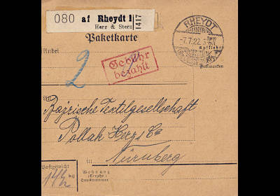 Rheydt 1: Inlandspaketkarte (14 500 g, > 75 km) vom 07.07.1922 mit rotem Rechteckstempel (2z) "Gebühr/ bezahlt" |