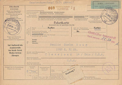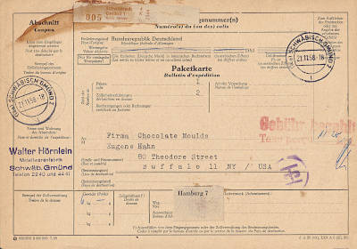 Schwäbisch Gmünd 1: Auslandspaketkarte (5 500 g) vom 25.11.1958 mit Zweizeiler (2z) "Gebühr bezahlt/ Taxe perçue DM" und handschriftliche Gebührenhöhe "12,20" |