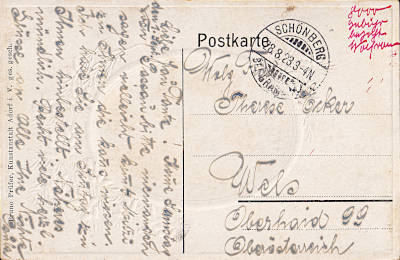 Schönberg (bei Brambach): Auslands- postkarte zum Inlandstarif vom 28.08.1923 mit rotem Gebührenvermerk "8 000/ Gebühr/ bezahlt" |