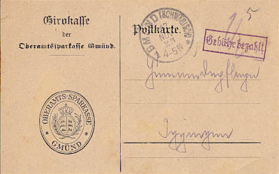 Schwäbisch Gmünd 1: Inlandspostkarte vom 17.11.1923 mit violettem Rechteck-stempel (z) "Gebühr bezahlt" und handschrift-liche Gebührenhöhe "5 (Milliarden Mark)" |