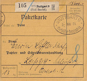 Stuttgart 9: Inlandspaketkarte (13 000 g, 75-375 km) vom 03.08.1923 mit schwarzem Ovalstempel (bozbu) "STUTTGART 9/ (Datum)/ Gebühr bezahlt" und handschrift-liche Gebührenhöhe "18 600" |