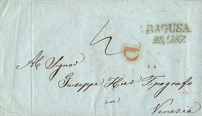 schwarzer Zweizeiler "RAGUSA/ 28 LUG" auf Brief vom 28.07.1847 nach Venezia (Venedig)