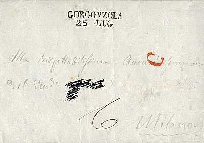 schwarzer Zweizeiler "GORGONZOLA/ 28 LUG" auf Brief vom 28.07.1846 nach Milano (Mailand)