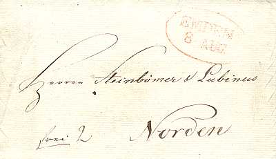 roter Ellipsenstempel "EMDEN/ 8 AUG" auf Brief vom 08.08.1823 nach Norden