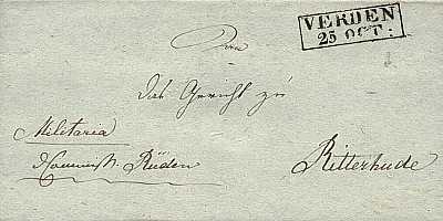 schwarzer Rechteckstempel "VERDEN/ 25 OCT" auf Brief vom 25.09.1826 nach Ritterhude