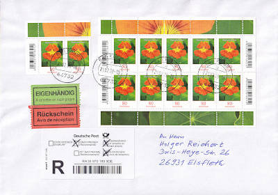 Inlandsbrief mit Übergabe-Einschreiben, Rückschein und eigenhändiger Zustellung frankiert mit 12 Marken a 80 Cent (Mehrfachfrankatur) |