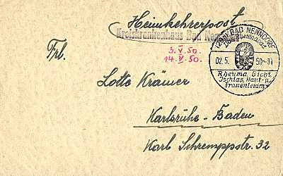 Postal Marking Homecoming Shipment: marking indicating a free of charge postal shipment for returning soldiers who have not yet been able to be released due to their wounds or illness |