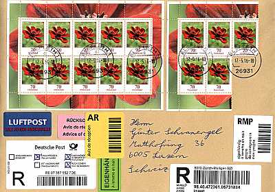 Postage Fee Breakdown: breakdown of the face value of postage stamps on a postal shipment into basic and additional services fees: Foreign cover with registeration, return receipt, and special delivery (51-500 g) franked with 15 stamps a 70 cents (=1,050 cents, 370 cover, 250 registeration, 215 return receipt, 215 special delivery) |