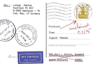 Poste Restante: free of charge additional service in which a postal shipment is not delivered but is picked up by the recipient at the counter of a post office (charges apply in Germany until November 31, 1923) |