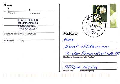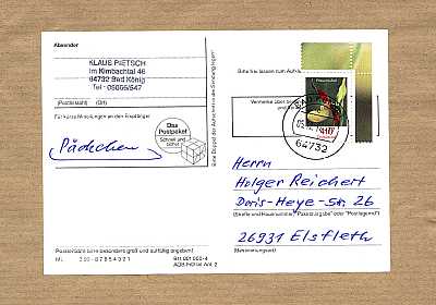 Postcard With Answer: connected double card consisting of a question and an answer part. The first sender describes the question part and sends the double card to the recipient. This removes the question part and sends back the described answer part |