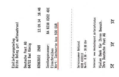 Open Insurance: postal shipment with a value statement that this additional service can be identified "Wert M 156,000,000" |