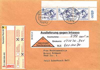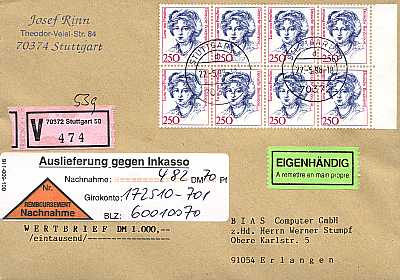 Cover with value, personal delivery, special delivery and advice of delivery |