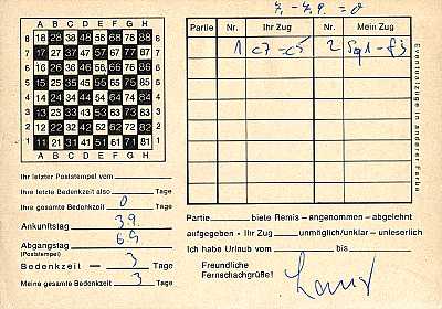 Correspondence Chess Card: postcard form for the purpose of transmitting moves between correspondence chess opponents |