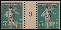 1 Piaster auf 25 Centimes blau waagrechtes Zwischenstegpaar mit Jahreszahl (191)9