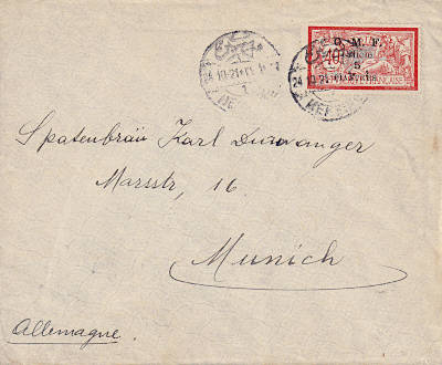 Auslandsbrief vom 26.10.1921 von Mersina nach München frankiert mit einer Briefmarke a 5 Piaster auf 40 Centimes mit fettem Aufdruck und 1 mm Abstand zwischen "Cilicie" und "Wertziffer"