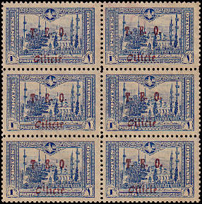 block of 6 with split overprint without "Cilicie" in the top line, with "Dot" in the 2nd line right and "ITI" in the 3rd line left |