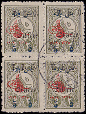 Postal order (5000 Piaster) from 02.08.1919 from Adana franked with 4 postage stamps of 1 Piaster with Large block stamp and 4 postage stamps a 5 Piaster with typographed overprint |