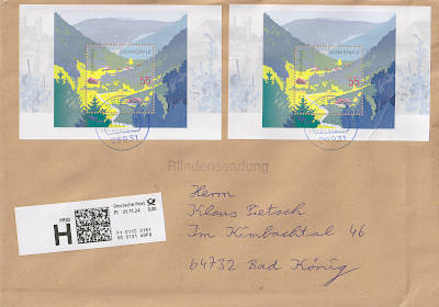 Auslandsbrief (1-20 g) vom 22.06.2021 (10. Periode) frankiert mit 2 Blocks a 55 Cent (=1,10 €) |